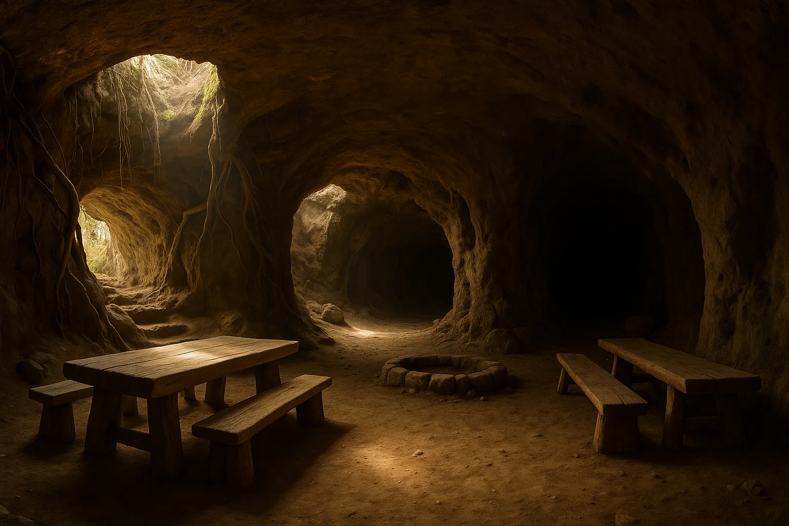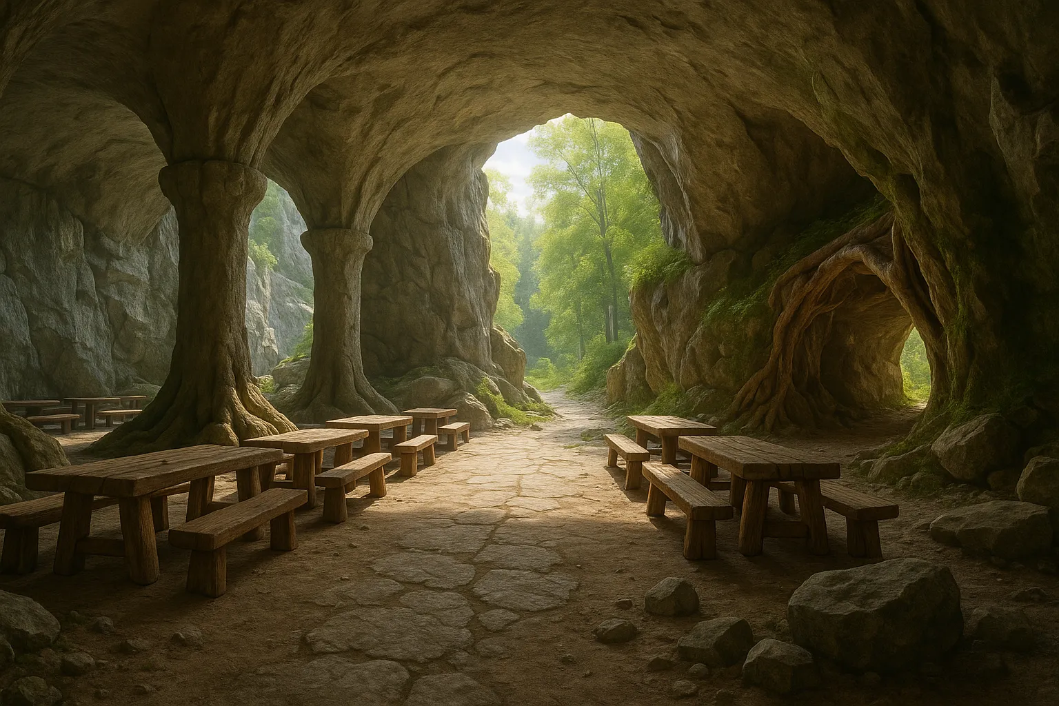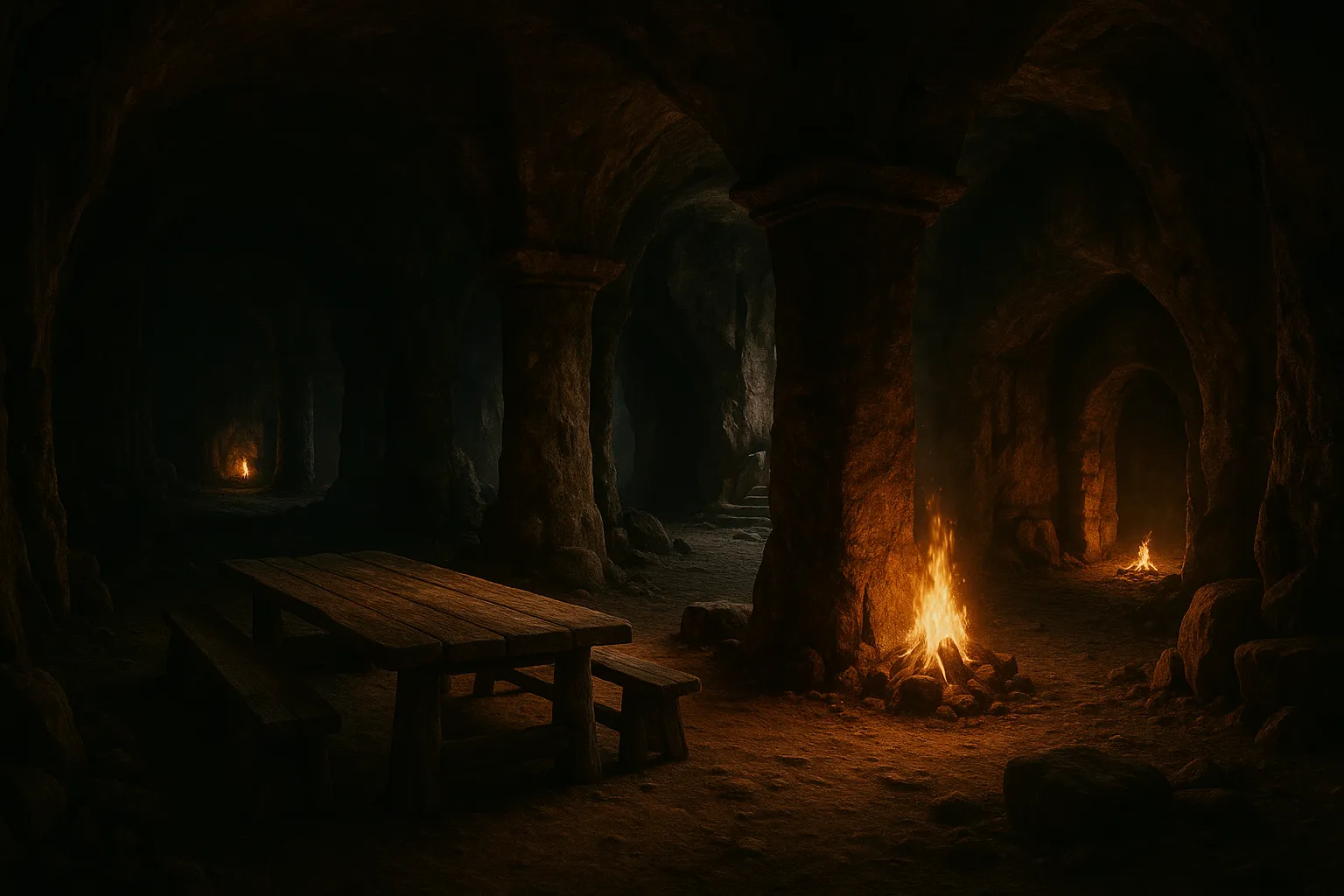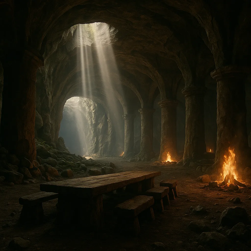 Innanför väntar bergsalen. Taket bärs av grova pelare där kvarts och glimmer fångar ljuset från tjärbloss och märgade vedträn. Längs väggarna står tunga bord och kistor med kopparkärl, smycken och tyg med ovanliga mönster. Mycket är bortrövat från gårdar, och mycket är bara sken. Det som glimmar kan bli till löv och bark när tuppen gal eller solen når tröskeln. Luften är stilla och tjock, men då och då skälver berget av dans, fiolspel och klirr från bägare.