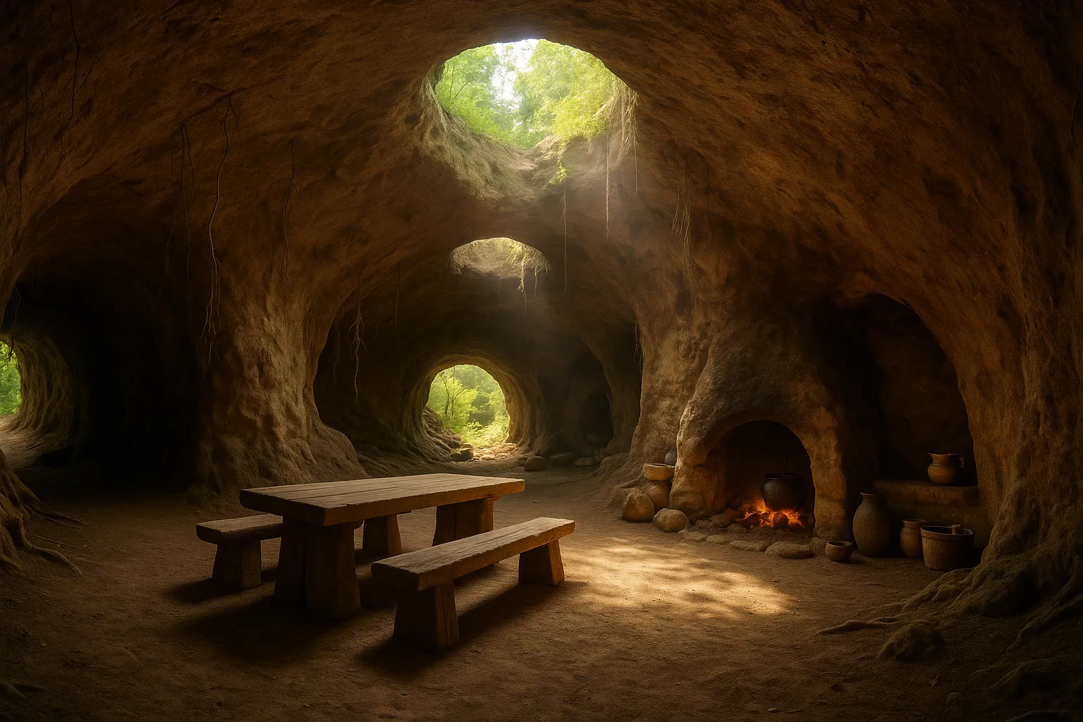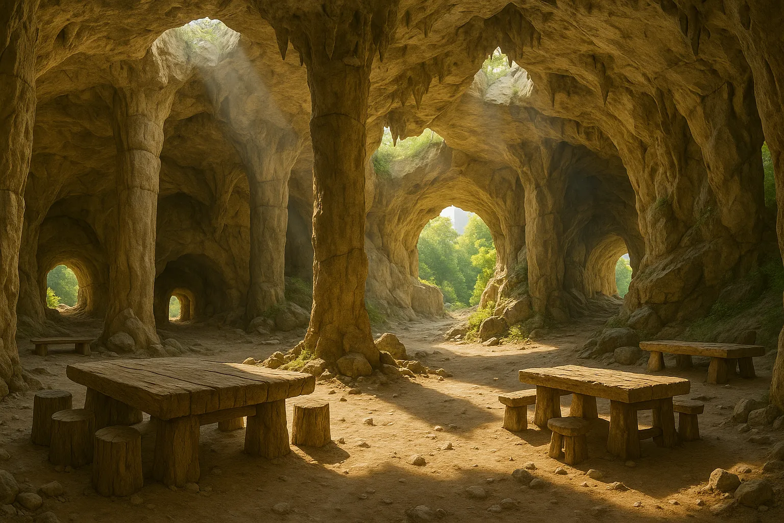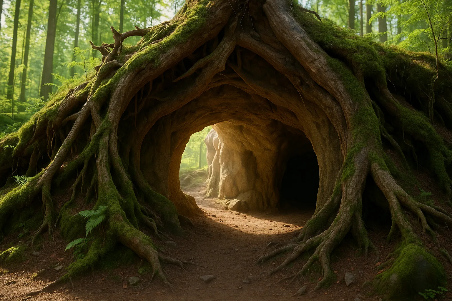 Innanför väntar bergsalen. Taket bärs av grova pelare där kvarts och glimmer fångar ljuset från tjärbloss och märgade vedträn. Längs väggarna står tunga bord och kistor med kopparkärl, smycken och tyg med ovanliga mönster. Mycket är bortrövat från gårdar, och mycket är bara sken. Det som glimmar kan bli till löv och bark när tuppen gal eller solen når tröskeln. Luften är stilla och tjock, men då och då skälver berget av dans, fiolspel och klirr från bägare.