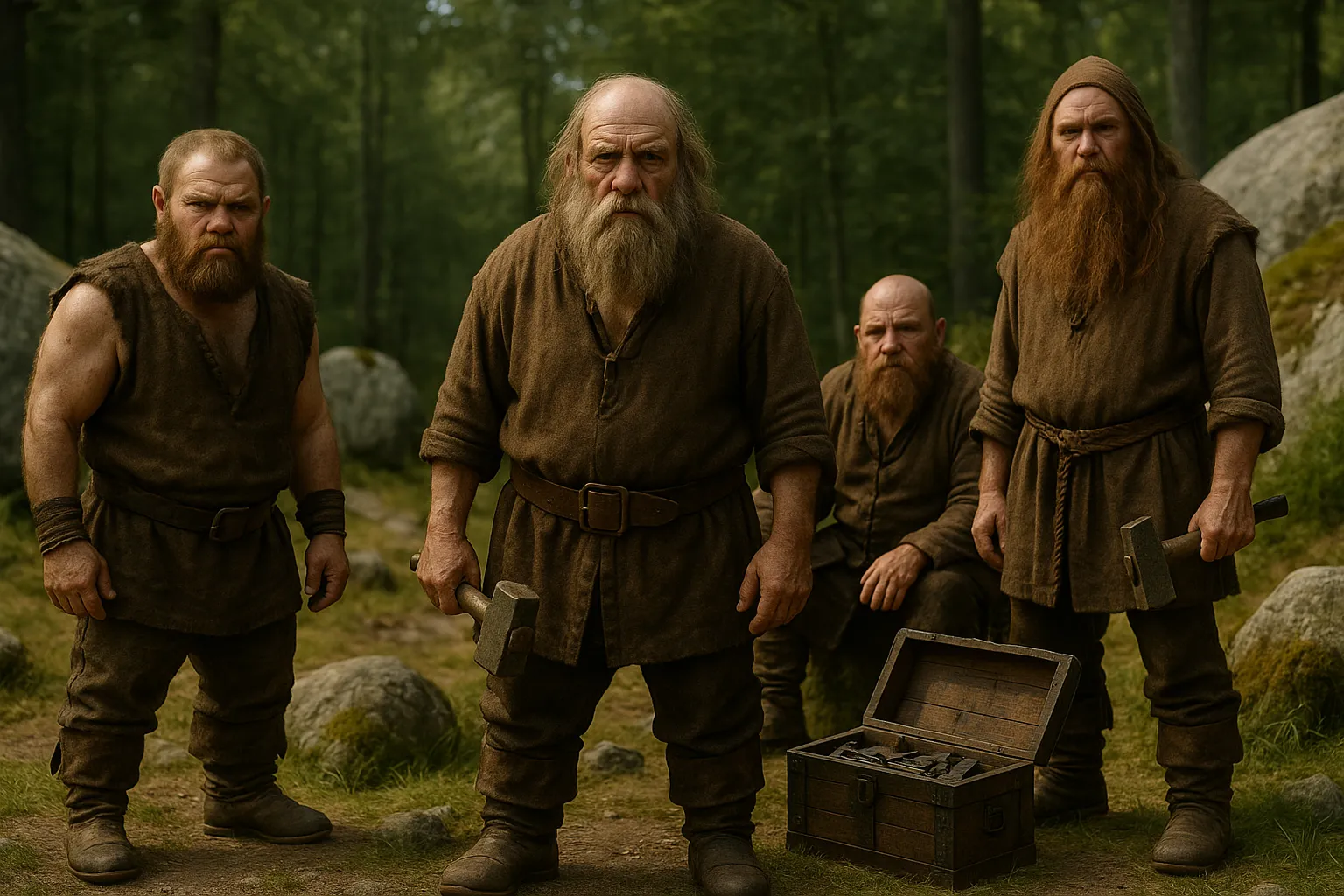 Dvärgar framställs i nordisk folktro som ett underjordiskt folk som håller till i berg, gruvor och stenhällar. De är kortväxta men kraftigt byggda, ofta med mörka, vaksamma ögon och sot- eller bergsdamm på hud och kläder. Deras dräkt är praktisk: ull och läder, förkläden och bälten tyngda av verktyg. De visar sig sällan i dagsljus och arbetar helst när världen ovanför somnat; den som lyssnar kan höra dova slag, slipstenens sus och dämpade röster från hjärtat av berget.