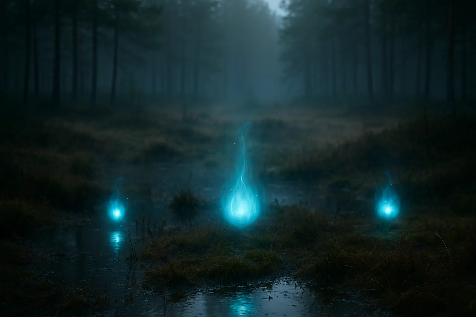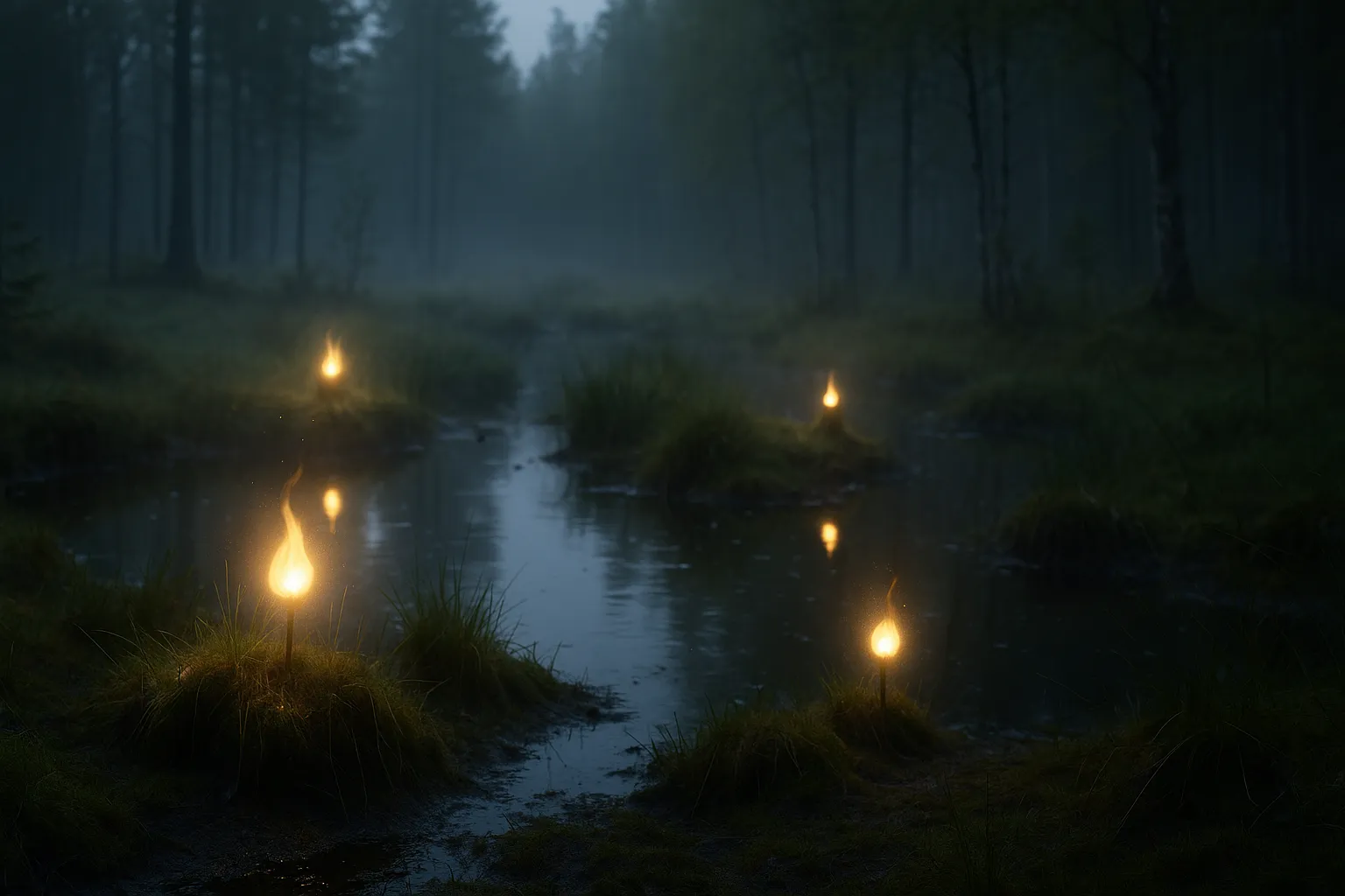 Irrbloss visar sig som små, blåvita eller grönaktiga lågor som glider lågt över marken. De stannar precis utom räckhåll, delar sig i två, svävar över en tuva och drar sedan vidare – alltid ett steg framför den som följer. De värmer inte; luften blir i stället stilla och sval, och ibland anas en söt, jordig doft av myr och gammal torv. Djur tvekar, steg låter dova och avstånd känns längre än de är.