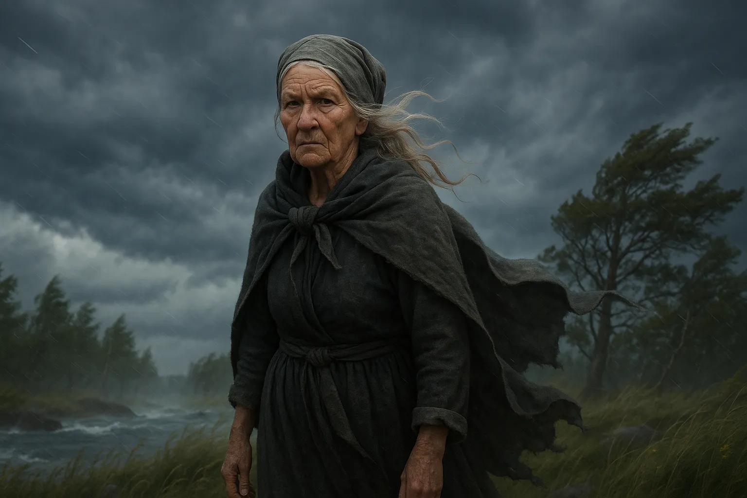 Stormkäringen behärskar väder och sikt. Hon kan väva sjok av dimma, kasta hagel som grus över däck, vrida byar så rigg och sinne går i baklås – och låta tiden glida så att en halvtimme vid udden blir en natt i sjön. I andra sägner varnar hon: en ensam tung våg långt före fronten, ett lågt muller under ytan, ett drag som pekar åt trygg kurs just innan allt brister.